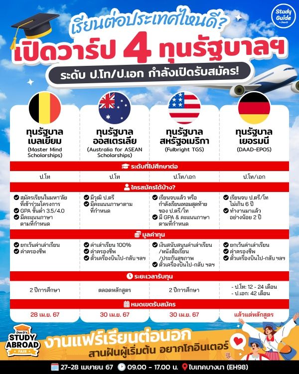 The opportunity is yours! สำหรับเด็กจบใหม่หรือวัยทำงานที่มี passion อยากไปคว้าฝันเรียนต่อต่างประเทศ ช่วงนี้มีทุนรัฐบาลจากหลายประเทศกำลังเปิดรับสมัครกันรัวๆ เลยค่ะ วันนี้ Study Guide ได้สรุปข้อมูลทุนจาก 4 ประเทศมาให้แล้ว ซึ่งความปังคือเป็น #ทุนเต็มจำนวน และบางทุนมีโควตาให้คนไทยโดยเฉพาะอีกด้วย! ว่าแต่จะมีประเทศไหนบ้าง และแต่ละทุนน่าสนใจยังไง ตามมาเช็กรายละเอียดกันเลย~