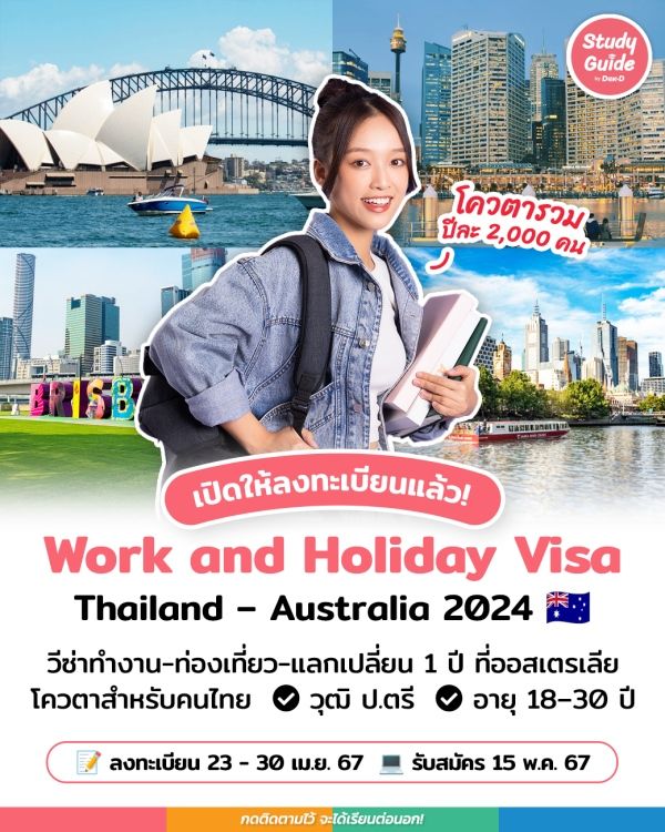 สวัสดีครับชาว Dek-D ใครอยากเป็น #ทีมออสเตรเลีย ตอนนี้ได้เวลาแล้ว! ล่าสุดกรมกิจการเด็กและเยาวชน ได้ประกาศการรับสมัครเยาวชนไทยอายุ 18-30 ปี เข้าร่วม โครงการตรวจลงตราทำงานและท่องเที่ยวไทย - ออสเตรเลีย ประจำปี 2567 (Work and Holiday Visa Thailand - Australia 2024) โดยปีนี้มีโควตารวมทั้งหมด 2,000 คน ส่วนรายละเอียดอื่นๆ มีอะไรอัปเดตบ้าง บทความนี้ได้สรุปมาให้แล้วครับ!