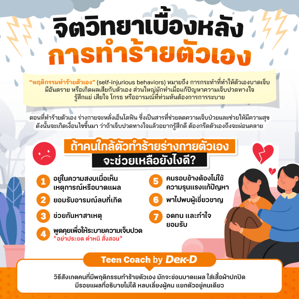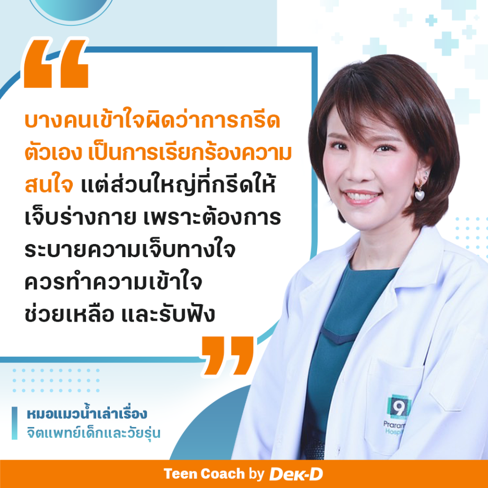 Referencehttps://kidshealth.org/en/parents/help-cutting.htmlhttps://www.psycom.net/cutting-self-harm-teenshttps://www.parenting.org/article/Pages/understanding-teen-cutting-and-self-harm.aspxhttps://www.health.harvard.edu/blog/cutting-and-self-harm-why-it-happens-and-what-to-do-202305312940พี่หมอแมวน้ำขอเป็นกำลังใจให้กับน้อง ๆ ที่ต้องเจ็บปวดทางใจแล้วยังไม่มีทางออกที่เหมาะสม ขอให้ได้รับความช่วยเหลืออย่างเร็วที่สุดนะคะ หรือมีอะไรคอมเมนต์ที่ข้างใต้นี้ได้เลยค่ะ
