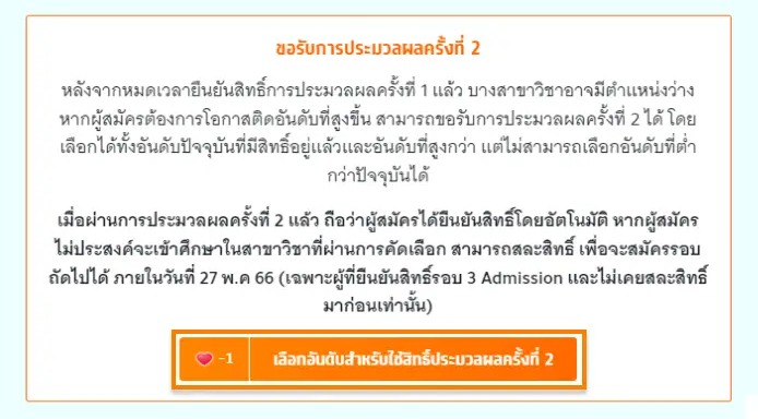 ใครที่ไม่ผ่านการคัดเลือกเเลยในครั้งที่ 1 ระบบจะขึ้นปุ่มให้เลือกปุ่มเดียว คือ "เลือกอันดับสำหรับใช้สิทธิ์ประมวลผลครั้งที่ 2" โดยจะให้เลือกอันดับที่ต้่องการจะขอประมวลผลใหม่ได้ จะเลือกทั้ง 10 อันดับเลยก็ได้ จะเลือกแค่บางอันดับก็ได้ แต่ต้องเข้าใจด้วยว่า เมื่อประกาศผลครั้งที่ 2 ออกมาแล้ว ระบบจะยืนยันสิทธิ์ให้อัตโนมัติ ไม่ว่าจะออกมาเป็นอันดับไหนก็ตาม