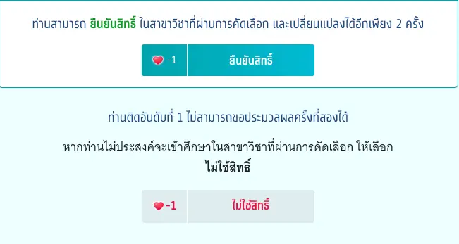 คนกลุ่มนี้จะไม่สามารถขอประมวลผลครั้งที่ 2 ได้อีก โดยระบบจะมีให้เลือกแค่ 2 ปุ่มเท่านั้น คือ ปุ่มยืนยันสิทธิ์ และปุ่มไม่ใช้สิทธิ์