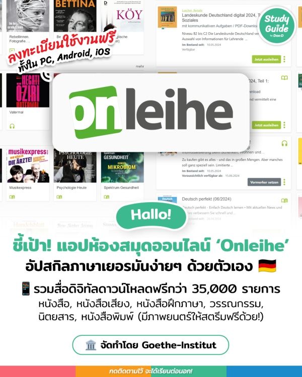 Hallo! สำหรับใครที่กำลังเรียน #ภาษาเยอรมัน แล้วอยากอัปสกิลให้เป๊ะปังและใช้สื่อสารได้อย่างมั่นใจ หรืออยากเรียนไว้เพื่อเพิ่มโอกาสโยกย้ายไปทำงานหรือเรียนต่อที่ประเทศเยอรมนี วันนี้ Study Guide จะมาเปิดวาร์ปแอปพลิเคชันห้องสมุดออนไลน์ "Onleihe" จาก Goethe-Institut หรือสถาบันเกอเธ่ บอกเลยว่ามีสื่อดิจิทัลให้เลือกดาวน์โหลดกว่า 35,000 รายการเลยทีเดียว!