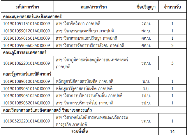 - สาขาวิชาบริหารธุรกิจ กลุ่มวิชาการจัดการธุรกิจระหว่างประเทศ (นานาชาติ) ภาคปกติ 5 ที่นั่ง