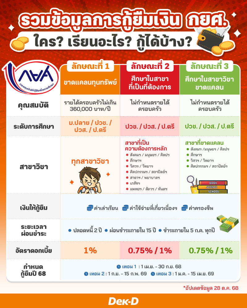 คำถามนี้เป็นคำถามที่พบบ่อยให้เว็บบอร์ดปัญหาวัยรุ่นบนเว็บ Dek-D.Com และเชื่อว่าเป็นปัญหาใหญ่ของน้องๆ นักเรียน นักศึกษาหลายๆ คน วันนี้พี่แพมรวบรวมข้อมูลเกี่ยวกับกองทุนกู้ยืมเพื่อการศึกษา หรือ กยศ. ประจำปี 2568 มาให้แล้วค่ะ