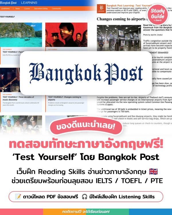 ใครที่กำลังเตรียมตัวสอบภาษาอังกฤษ ไม่ว่าจะเป็น IELTS, TOEFL, PTE หรือการสอบอื่นๆ เพื่อใช้เป็นคะแนนยื่นในการสมัครเรียนต่อมหาวิทยาลัยในไทย/ต่างประเทศ วันนี้ Study Guide มีแหล่งฝึกฝนทักษะการอ่าน (Reading Skills) จากสำนักข่าว Bangkok Post มาแนะนำกัน!