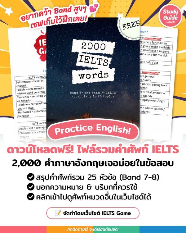 วันนี้ Study Guide ขอมาชี้เป้าพิกัดไฟล์หนังสือ ‘2000 IELTS Words’ โดยเว็บไซต์ IELTS Game ที่ได้รวบรวมคำศัพท์ระดับ Band 7 & 8 ในหลากหลายหัวข้อกว่า 2,000 คำมาให้ทุกคนดาวน์โหลดฟรีเก็บไว้ฝึกฝนก่อนลงสนามสอบจริง ไม่ว่าจะพาร์ตฟัง-พูด-อ่าน-เขียน ถ้ามีคลังศัพท์เยอะก็อาจช่วยให้พิชิตคะแนนได้มากขึ้นก็ได้นะ!