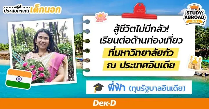 สวัสดีค่ะชาว Dek-D ใครอยากเรียนต่อประเทศที่ไม่ไกล ได้ฝึกภาษาอังกฤษ และเจอประสบการณ์ครบรส อินเดียนับว่าติ๊กถูกทุกข้อเลยนะคะ เดี๋ยววันนี้จะพาไปรู้จัก “พี่ฟ้า-นันธิดา พรอินทร์” นักเรียนทุนรัฐบาลอินเดีย ที่เรียนจบ ป.ตรี Business Administration (Travel and Tourism) จาก Rosary College of Commerce and Arts ของ Goa University หรือ มหาวิทยาลัยรัฐในเมืองตาเลเกา (Taleigão) ประเทศอินเดีย