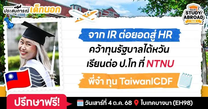 และหนึ่งในทุนฮิต และครอบคลุมค่าใช้จ่ายเต็มจำนวน ก็คือทุน TaiwanICDF นั่นเองค่ะ ทุนนี้ดียังไง? เลือกเรียนสาขาและมหา'ลัยไหนได้บ้าง? เริ่มเตรียมตัวยังไงดี? วันนี้เราจะพาไปอ่านรีวิวประสบการณ์ “พี่จ๋า–ศริญญา เจียรสุข” คนไทยที่จบ ป.โท International Human Resource Development จาก National Taiwan Normal University ที่ตั้งอยู่ในกรุงไทเป // พี่จ๋าเป็นเด็กกิจกรรมตัวยงตั้งแต่อยู่ไทย แล้วพอไปถึงไต้หวันก็ไม่แผ่ว แล้วสิ่งที่ทำก็พาโอกาสมาให้เยอะมากแบบไม่คาดคิด รวมไปถึงการขอทุนสำเร็จในครั้งนี้ด้วย ประสบการณ์เรียนที่ไต้หวันครั้งนี้พาไปเจออะไรบ้าง เราไปเริ่มพาร์ตแรกกันเลยค่ะ