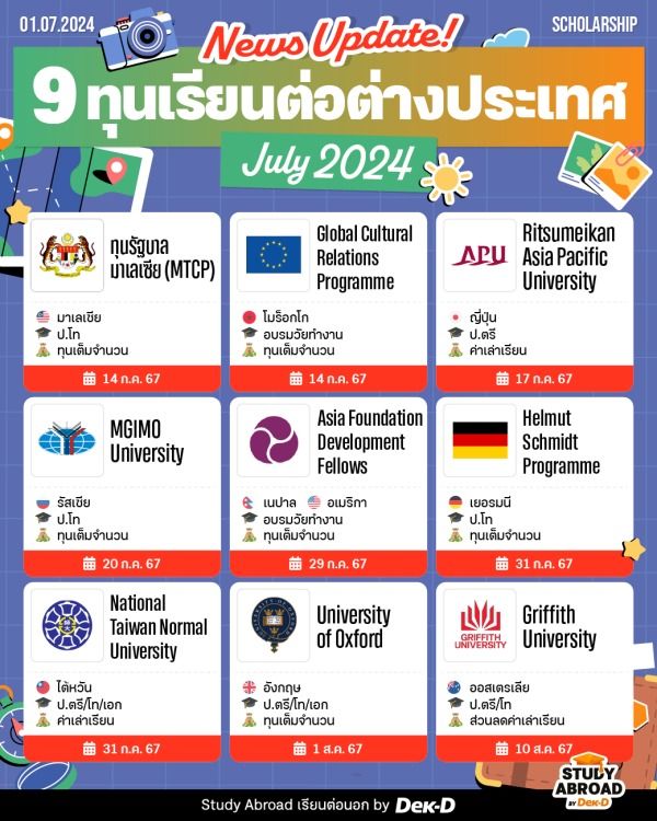 Welcome to the second half of the year! เข้าสู่ครึ่งหลังของปี 2024 กันแล้ว บอกเลยว่าเตรียมรับข่าวดี เพราะเร็วๆ นี้จะมีทุนปังๆ เปิดรับสมัครอีกเพียบ ส่วนเดือนนี้ Study Abroad by Dek-D ก็มีทุนเรียนต่อทั้งระดับ ป.ตรี ป.โท และป.เอก รวมถึงทุนอบรมระยะสั้น มาอัปเดตกันอีกเช่นเคย ซึ่งแต่ละโครงการคือน่าสนใจมากๆ ใครอยากเก็บเกี่ยวประสบการณ์ใหม่ๆ ในต่างประเทศ ตามไปเช็กข้อมูลกันได้เล้ยย~