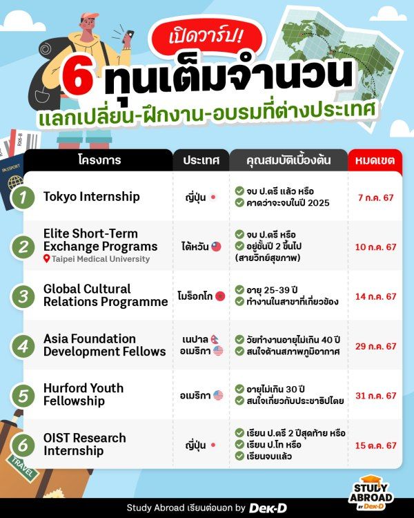 Don't let the chance slip away! สำหรับใครที่อยากบินลัดฟ้าไปเปิดประสบการณ์ใหม่ๆ ในต่างประเทศ วันนี้ Study Abroad by Dek-D ได้รวบรวมทุนแลกเปลี่ยน ทุนฝึกงาน และทุนอบรมระยะสั้น ที่กำลังเปิดรับสมัครอยู่ 6 โครงการในช่วงนี้มาให้แล้ว แต่ละโครงการให้ทุนเต็มจำนวนฟรีตลอดทริป แถมยังเป็นโอกาสสร้างคอนเน็กชันกับเพื่อนๆ จากทั่วทุกมุมโลกด้วย! อย่ารอช้า รีบตามไปเช็กรายละเอียดกันเลยค่าา~