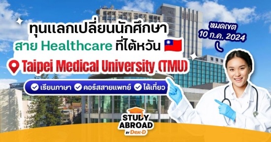 ตอนนี้ทาง Taipei Medical University (TMU) กำลังเปิดรับสมัครคนไทยที่เรียนจบแล้วและนักศึกษา ป.ตรี สายวิทย์สุขภาพ เข้าร่วมโครงการแลกเปลี่ยน ‘2024 New Southbound Policy Elite Short-Term Exchange Programs’ ระหว่างวันที่ 16 กันยายน 2024 - 30 มกราคม 2025 (รวม 5 เดือน) โดยนักศึกษาแลกเปลี่ยนจะได้ทำกิจกรรมต่างๆ เช่น เรียนภาษาจีนกลาง, เรียนคอร์สสายการแพทย์, ทัศนศึกษานอกมหา’ลัย เป็นต้น