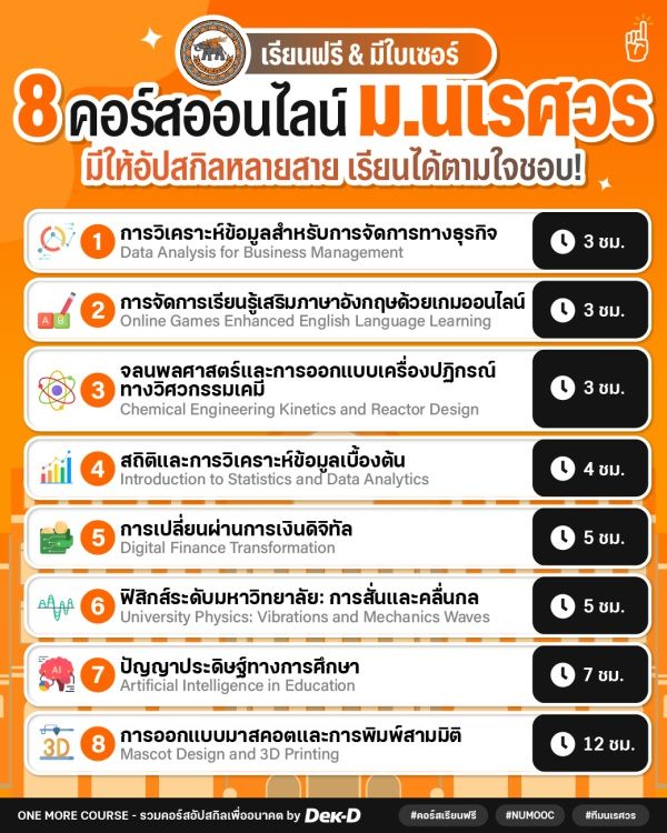 #คอร์สดีบอกต่อ ใครกำลังหาแหล่ง Upskills & Reskills เก็บไว้เติมทักษะใหม่ๆ ใช้ต่อยอดการเรียนและการทำงานในครึ่งปีหลัง วันนี้ One More Course ขอมาเปิดวาร์ป 8 คอร์สออนไลน์ เรียนฟรีมีใบเซอร์ ส่งตรงจากแพลตฟอร์ม 'NU MOOC' มหาวิทยาลัยนเรศวร จัดมาให้ทั้งสาย Data, AI, การศึกษา, ภาษาอังกฤษ และอีกมากมาย! บอกเลยว่าแต่ละวิชาคือเนื้อหาเข้มข้นมากๆ ปังขนาดนี้รีบแท็กชวนคนใกล้ตัว แล้วตามมาอัปสกิลด้วยกันเล้ยย~