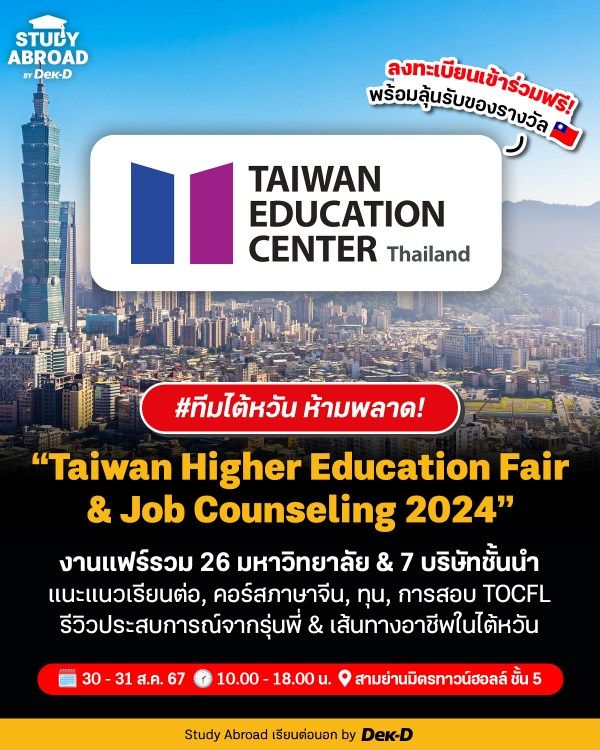 ใครอยากเป็น #ทีมไต้หวัน เตรียมล็อกคิว 30-31 สิงหาคม 67 นี้ไว้เลย! เตรียมพบกับงานแฟร์ฟรี "Taiwan Higher Education Fair & Job Counselling 2024" นิทรรศการเรียนต่อ & เส้นทางสู่อาชีพ โดยศูนย์แนะแนวการศึกษาไต้หวัน ประจำประเทศไทย ไม่ว่าจะเรียนต่อปริญญา คอร์สภาษาจีน หาทุนการศึกษา แนะแนวเส้นทางอาชีพในไต้หวัน ฯลฯ ก็มีข้อมูลครบจบในงานเดียว ที่สำคัญเข้าฟรี ไม่มีค่าใช้จ่าย พร้อมลุ้นรับของรางวัลพิเศษในงาน!