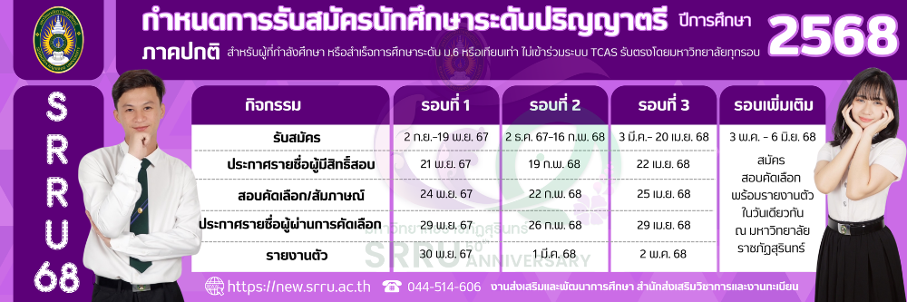 มหาวิทยาลัยราชภัฏสุรินทร์ เตรียมเปิดรับสมัครนักเรียนม.6, เทียบเท่า และเด็กซิ่ว ทั้งหมด 4 รอบ แบบไม่เข้าร่วม TCAS68 ตามกำหนดการรับสมัคร ดังนี้