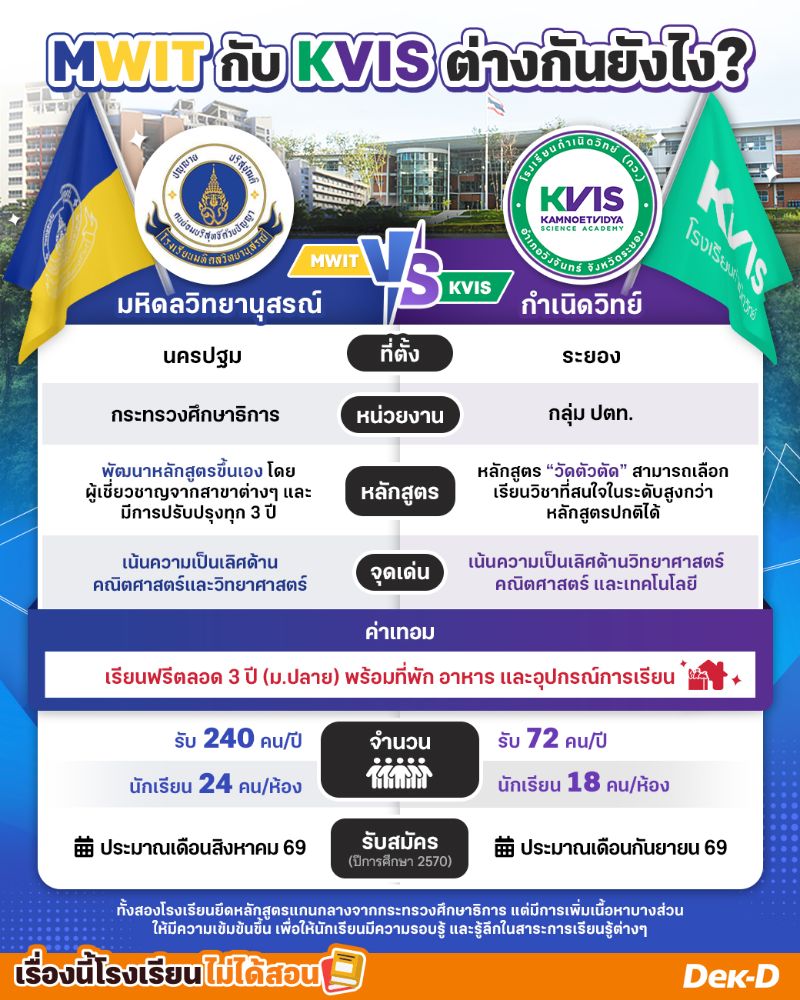 หากพูดถึงโรงเรียนมัธยมปลายสายวิทย์-คณิต ที่เป็นต้นแบบการผลิตนักวิทยาศาสตร์ และนักวิจัยระดับประเทศ เชื่อว่าน้องๆ คงนึกถึงโรงเรียนมหิดลวิทยานุสรณ์ (MWIT) และกำเนิดวิทย์ (KVIS) ทั้งจากกระแสรายการแข่งขันวิชาการ Genwit อัจฉริยะพันธุ์ใหม่ หรือการแข่งขันโอปิกวิชาการที่มีชื่อนักเรียนของทั้งสองแห่งติดอันดับทุกปี ทำให้ทั้งสองโรงเรียนมีภาพจำเด็กเก่ง ในวันนี้ Dek-D จะพาทุกคนไปทำความรู้จักกับทั้งสองโรงเรียนว่าแต่ละแห่งมีหลักสูตรการเรียนการสอน และความน่าสนใจอย่างไรบ้าง ถ้าพร้อมแล้วไปดูกันเลย!