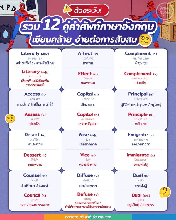 วันนี้พี่น้ำพุเลยได้รวบรวมมาให้แล้วกับ 12 คู่คำศัพท์ในภาษาอังกฤษที่เขียนคล้าย ง่ายต่อการสับสน เขียนผิดไปตัวเดียวอาจเปลี่ยนความหมายและ part of speech แบบไม่รู้ตัว จะมีคู่คำศัพท์ไหนที่เราต้องระมัดระวังกันบ้าง เราตามไปดูพร้อมกันเลยครับ