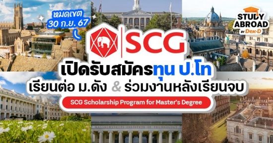 SCG เปิดรับสมัครบุคคลทั่วไปรับทุนเต็มจำนวนในโครงการ “SCG Scholarship Program for Master’s Degree” เพื่อเรียนต่อระดับ ป.โท ในสาขาวิชาและมหาวิทยาลัยที่บริษัทกำหนดในต่างประเทศ เช่น สหรัฐอเมริกา สหราชอาณาจักร ฝรั่งเศส อินเดีย จีน เป็นต้น