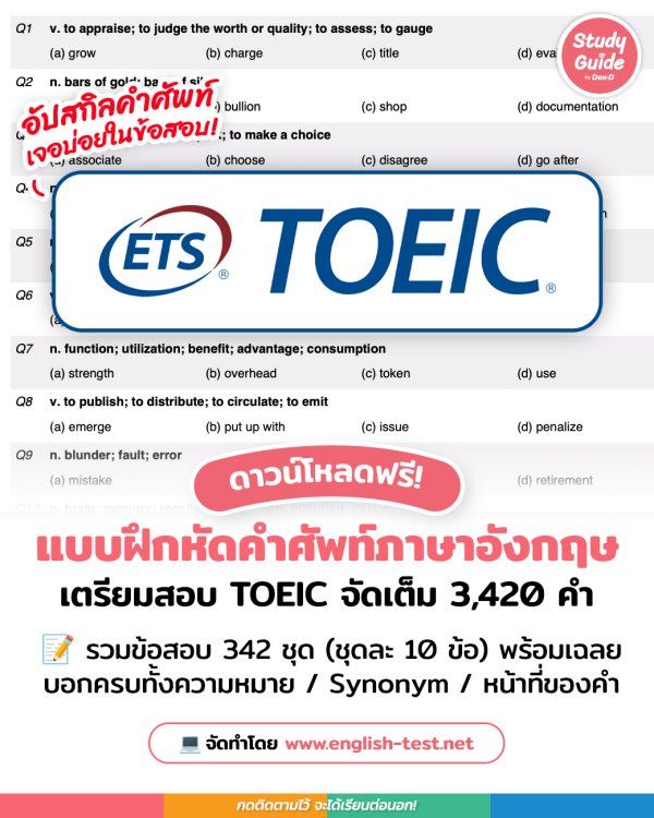 สำหรับผู้ที่กำลังเตรียมสอบ TOEIC หรือใครที่อยากเพิ่มคลังคำศัพท์ภาษาอังกฤษ เพื่อเตรียมตัวลงสนาม IELTS, TOEFL, PTE หรือการสอบอื่นๆ วันนี้ Study Guide by Dek-D ขอเปิดวาร์ปพิกัดแบบฝึกหัด “342 TOEIC Vocabulary Tests” ทดสอบความรู้คำศัพท์ภาษาอังกฤษ รวมทั้งหมด 3,420 คำที่เจอบ่อยในข้อสอบ TOEIC มาให้ทุกคนเซฟไปฝึกทำกันแบบเพลินๆ ได้เพิ่มคลังศัพท์แบบจัดเต็ม!
