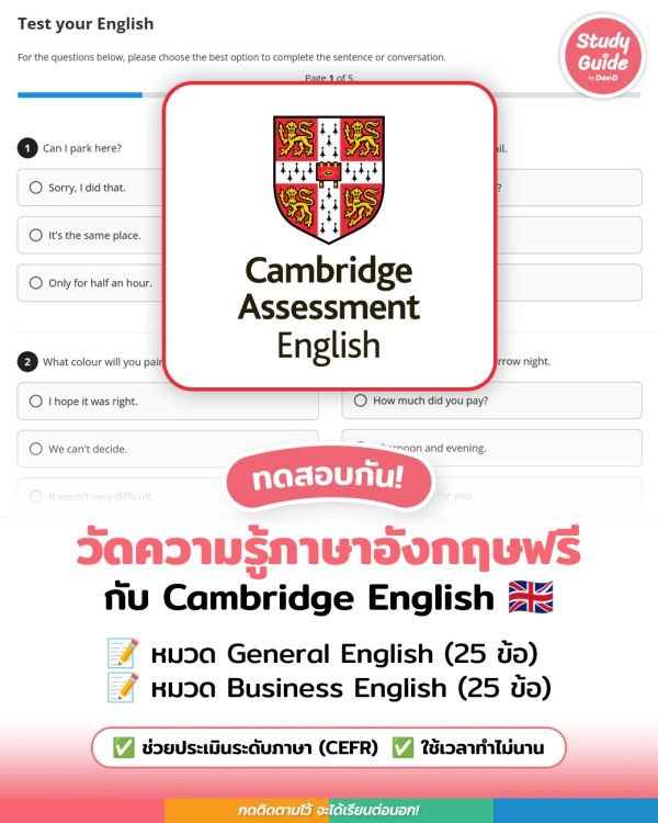 วันนี้ Study Guide by Dek-D ขอพาไปเปิดวาร์ปชุดข้อสอบจากเว็บไซต์ ‘Cambridge Assessment English’ หน่วยงานด้านการวัดและประเมินผลด้านภาษาอังกฤษแห่งมหาวิทยาลัยเคมบริดจ์ ที่ได้เปิดให้คนทั่วโลกเข้าไปวัดความรู้ภาษาอังกฤษแบบฟรีๆ