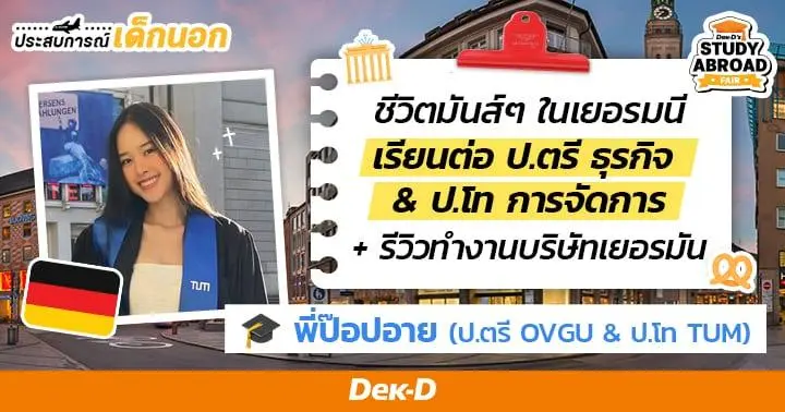 สวัสดีค่ะชาว Dek-D สำหรับทีมเยอรมันที่วางแผนจะเรียนยิงยาวไปจนถึงทำงานในบริษัทสัญชาติเยอรมัน วันก่อนเรามีโอกาสชวน “พี่อาย-ยมลพรพัศ” มาแชร์ประสบการณ์ภาคต่อหลังจากเรียนจบ ป.ตรี สาขาธุรกิจจาก Otto von Guericke University Magdeburg (OVGU) และ ป.โท สาขาการจัดการที่ Technical University of Munich (TU München) และระหว่างเรียน เธอตัดสินใจ(ถูกสุดๆ) ที่ไปทำงานเป็น “Working Student” เพราะเป็นโอกาสได้จับงานจริง รับค่าตอบแทนอย่างถูกกฎหมาย ใช้ความรู้กับโลกการทำงานจริง ที่สำคัญคือทำให้ CV ของเรามีปรากฎ [ประสบการณ์ทำงาน] สำคัญมากเพราะโดยทั่วไปวัยเรียนที่เยอรมันจะมีประสบการณ์ทำงานตั้งแต่เรียนแล้วค่ะ ถ้าขาดเราก็จะเสียเปรียบไปอีกหนึ่งข้อ