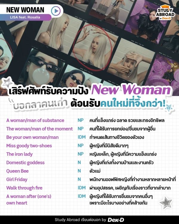 วันนี้ Study Abroad by Dek-D เลยขอแวะมาเสิร์ฟคำศัพท์ & สำนวนภาษาอังกฤษน่าสนใจฉบับ New Woman ให้ทุกคนจดไปใช้กัน พร้อมมีตัวอย่างประโยคให้ด้วย!
