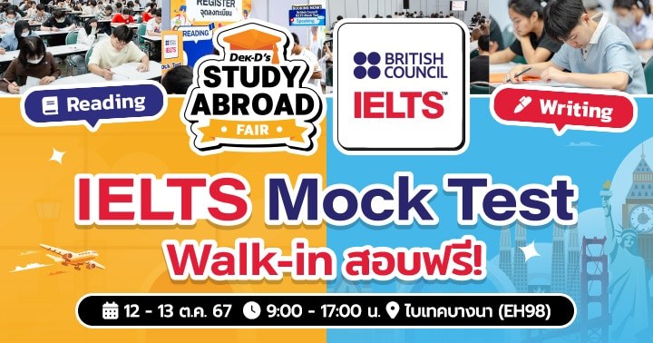 สวัสดีค่ะชาว Dek-D สำหรับใครที่กำลังเตรียมตัวสมัครเรียนต่อต่างประเทศหรือสมัครทุนโดยเฉพาะสหราชอาณาจักร, ออสเตรเลีย, แคนาดา, ยุโรป, ไอร์แลนด์, นิวซีแลนด์, สหรัฐอเมริกา, คณะอินเตอร์ในไทย แล้วในระเบียบการมหาวิทยาลัยหรือทุนนั้นๆ ระบุให้ใช้คะแนน ‘IELTS' (International English Language Testing System) แนะนำให้รีบเคลียร์คิววันเสาร์ที่ 12 หรือ อาทิตย์ที่ 13 ตุลาคม 2024 นี้ไว้นะคะ เพราะเราได้ยกห้องสอบจำลอง IELTS Mock Test มาเป็นหนึ่งในไฮไลต์ของ Dek-D’s Study Abroad Fair 2024 เพื่อให้ผู้เข้าร่วมได้ประเมินทักษะตัวเองและเตรียมพร้อมลงสนามจริงอย่างมั่นใจยิ่งขึ้น