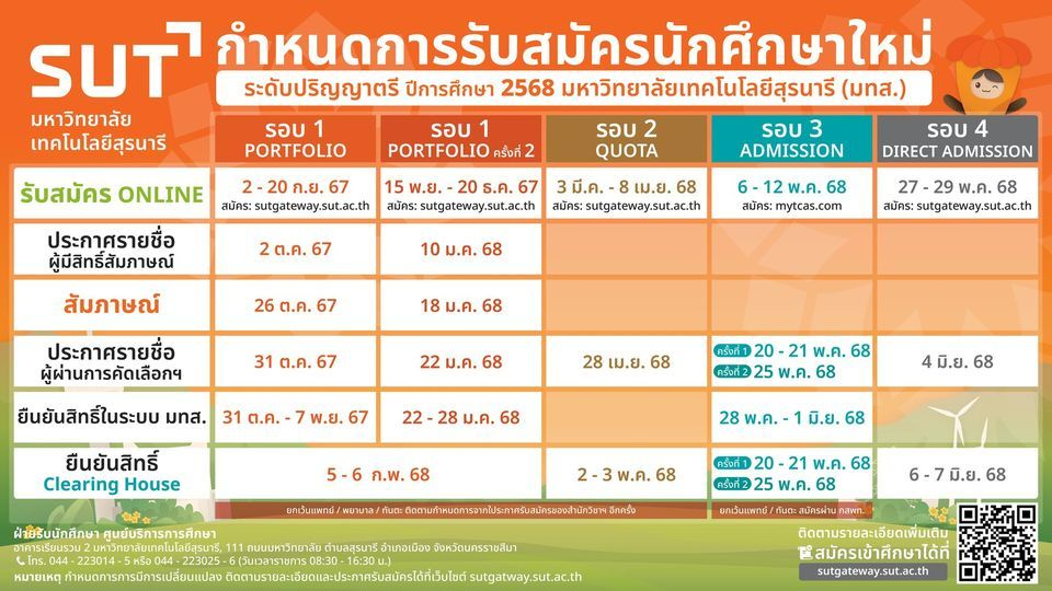 มาแล้ว! ปฏิทิน TCAS68 มหาวิทยาลัยเทคโนโลยีสุรนารี เริ่มรอบแรก 2 ก.ย. นี้