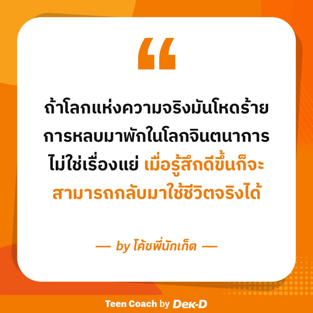 แต่อย่างไรก็ตาม การจินตนาการเหล่านี้ อาจจะถูกมองว่าเป็นการหลอกตัวเอง ฝันลม ๆ แล้ง ๆ หรือไม่ยอมรับความจริง แต่ในเมื่อความจริงมันโหดร้ายเกินไป การที่หนีมาพักพิงอยู่ในจินตนาการของเราบ้าง มันก็ไม่ใช่เรื่องที่แย่ เมื่อรู้สึกดีขึ้นก็สามารถกลับมาใช้ชีวิตจริงได้นั่นเอง