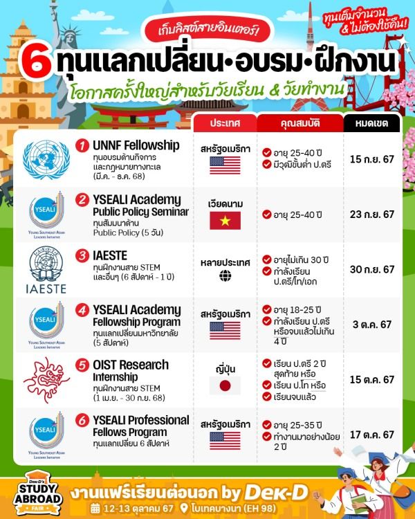 Opportunity is knocking on your door! สำหรับใครอยากเปิดประสบการณ์ใหม่ๆ ในต่างประเทศ ตอนนี้มี 6 โครงการทุนสุดปังกำลังเปิดรับสมัครอยู่ ไม่ว่าจะเป็นทุนอบรมระยะสั้น, ทุนฝึกงาน, ทุนแลกเปลี่ยน แถมยังครอบคลุมหลายระดับทั้ง ป.ตรี/โท/เอก และวัยทำงาน บางทุนใกล้ปิดรับสมัครแล้ว รีบตามไปอัปเดตกับ Study Abroad by Dek-D กันเลย