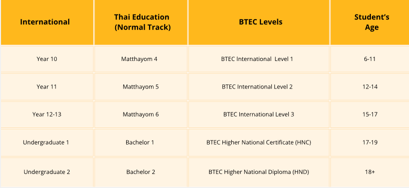 ด้วยการรวม BTEC Level 3 เข้ากับระบบ TCAS นักเรียนในประเทศไทยสามารถใช้คุณวุฒิ BTEC สมัครเข้าเรียนในหลักสูตรปริญญาตรีที่มหาวิทยาลัยกว่า 80 แห่งทั่วประเทศ การพัฒนาครั้งสำคัญนี้มอบความยืดหยุ่นให้กับนักเรียนที่ต้องการเรียนจบคุณวุฒิระดับโลกจากสหราชอาณาจักรในขณะที่ยังคงศึกษาอยู่ในมัธยมศึกษาปีที่ 6 พร้อมทั้งยังคงมีทางเลือกในการศึกษาต่อในประเทศไทย โดยมีโครงสร้างหลายระดับเพื่อให้เหมาะกับแต่ละระดับการศึกษาของผู้เรียน: