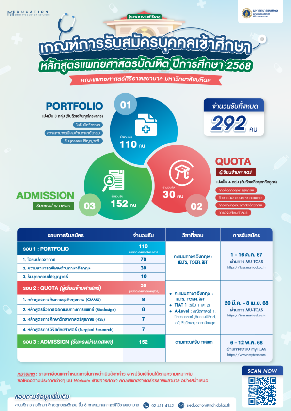 - คณะแพทยศาสตร์ศิริราชพยาบาล จะเปิดรับสมัครวันที่ 1 ตุลาคม 2567 นี้