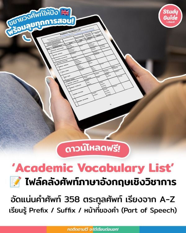 Let's expand your English Vocabulary! สำหรับใครที่อยากอัปเกรดงานเขียนภาษาอังกฤษเชิงวิชาการ (English for Academic Writing) หรือกำลังเตรียมสอบวัดระดับภาษาอังกฤษ ไม่ว่าจะเป็น IELTS, TOEFL, PTE, TOEIC ฯลฯ แต่ยังเจอปัญหาเรื่องคำศัพท์ บางทีก็ใช้ไม่ถูกบริบท หรือหลายครั้งก็แอบจำไม่ได้ วันนี้ Study Guide by Dek-D ขอมาแจกพิกัดไฟล์รวมลิสต์คำศัพท์เชิงวิชาการ ‘Academic Vocabulary List’ ให้ทุกคนได้ #ดาวน์โหลดฟรี เพื่อขยายวงศัพท์กัน!