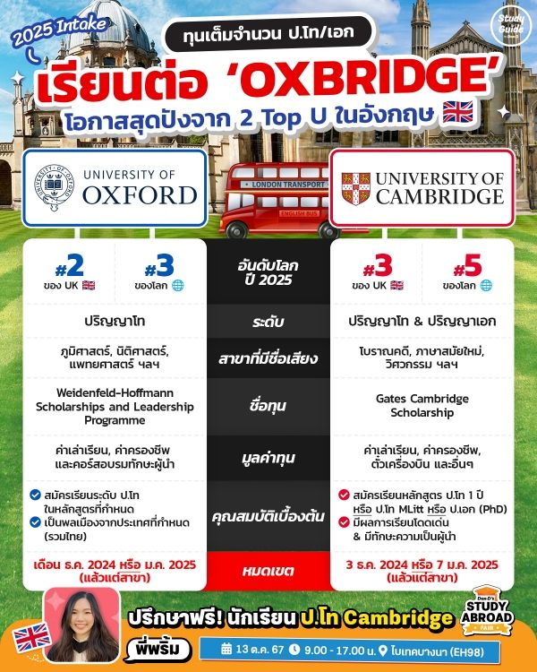 ใครอยากเรียนต่อ Top U ที่ประเทศอังกฤษ โอกาสครั้งใหญ่มาถึงแล้ว! ตอนนี้ 2 มหาวิทยาลัยระดับโลกอย่าง University of Oxford และ University of Cambridge กำลังเปิดรับสมัครนักศึกษาใหม่ระดับ ป.โท & ป.เอก ประจำปี 2025 แถมยังมีทุนเต็มจำนวน ครอบคลุมค่าเล่าเรียน, เบี้ยเลี้ยง และสิทธิประโยชน์อื่นๆ อีกเพียบ! ใครอยากเป็น #TeamOXBRIDGE รีบตาม Study Guide by Dek-D ไปเช็กรายละเอียดต่อกันเลย Let’s go~