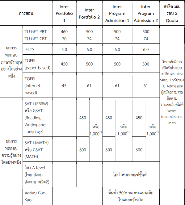 - ต้องมี GPAX ไม่น้อยกว่า 3.00 (รอบ Inter Portfolio 1) และ ไม่น้อยกว่า 2.85 (รอบ Inter Program Admission 1), มีคะแนนภาษาอังกฤษตามที่กำหนด