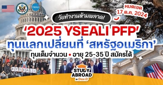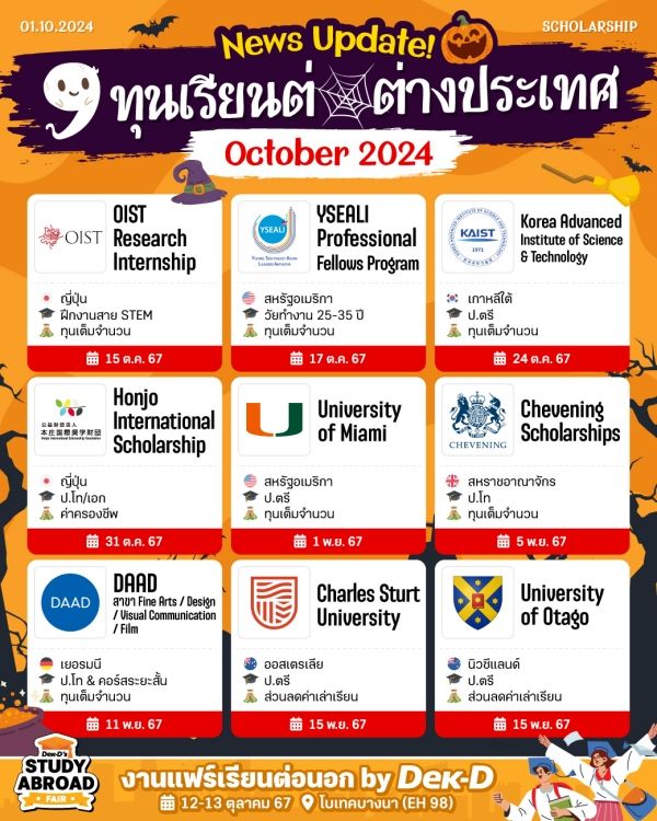 เผลอแปบเดียวก็เข้าสู่เดือนตุลาคมกันแล้ว~ ซึ่งช่วงนี้เทศกาลหลายมหาวิทยาลัยก็เปิดรับสมัครเรียนสำหรับปี 2025 กันอย่างคึกคัก รวมถึงโครงการทุนปังๆ ที่ #ทีมเด็กนอก หลายคนรอคอย ก็จ่อคิวเตรียมเปิดรับสมัครกันอีกเพียบ วันนี้ Study Abroad by Dek-D ก็ได้สรุปข้อมูลทุนน่าสนใจในช่วงนี้เอาไว้ให้แล้ว มีทั้ง #ทุนเรียนต่อ #ทุนฝึกงาน #ทุนวัยทำงาน จากหลากหลายประเทศไม่ว่าจะเป็น USA, UK, เกาหลีใต้, เยอรมนี, ออสเตรเลีย, ญี่ปุ่น และนิวซีแลนด์ // ใครไม่อยากพลาดโอกาสดีๆ รีบไปอัปเดตกันเลย~