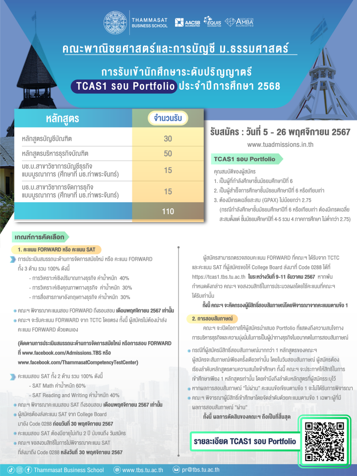 ผู้สนใจสามารถดูรายละเอียดการสมัครสอบและแนวตัวอย่างข้อสอบได้ที่ https://forward.tbs.tu.ac.th/ หรือ www.facebook.com/Admissions.TBS หรือ www.facebook.com/ThammasatCompetencyTestCenter