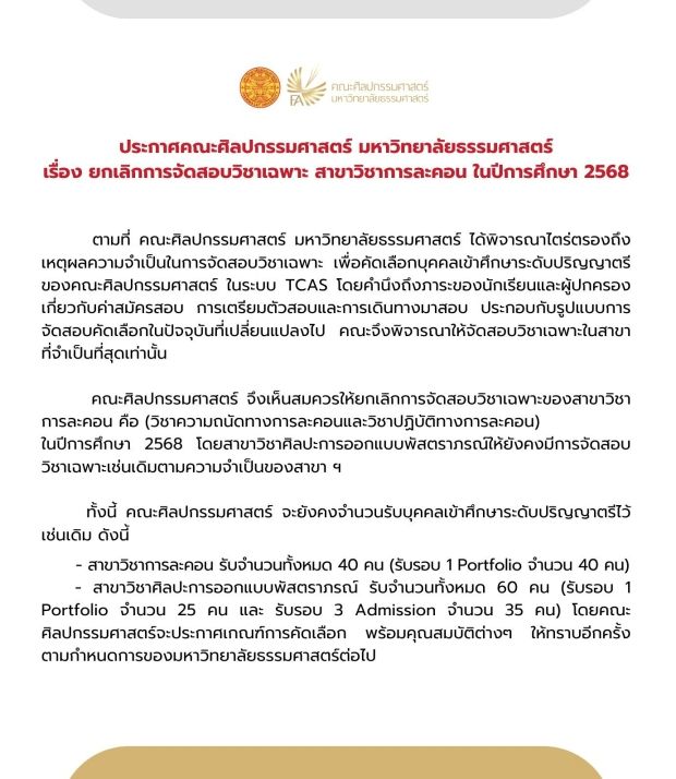 "การละคอน" ศิลปกรรมศาสตร์ ม.ธรรมศาสตร์ ยกเลิกจัดสอบวิชาเฉพาะ TCAS68 แล้ว