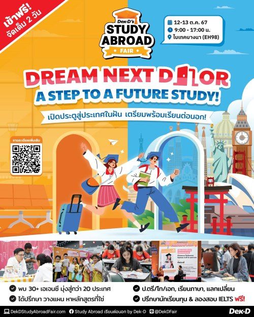 ตามมาด้วยอีกหนึ่งงานที่ #ทีมเด็กนอก ห้ามพลาด! งานแฟร์เรียนต่อต่างประเทศครั้งใหญ่ “Dek-D’s Study Abroad Fair” อีเวนต์สุดครบเครื่องต้อนรับเทศกาลสมัครเรียนต่อนอกปี 2025 ใครอยากเรียนต่อต่างประเทศ แต่ไม่รู้ต้องเริ่มยังไง? หาข้อมูลเองแล้วแต่ก็ยังไม่ได้คำตอบที่ตรงใจสักที มางานนี้จะได้คุย ได้ปรึกษา ได้รับข้อมูล ได้เปรียบเทียบเพื่อประกอบการตัดสินใจให้ง่ายกว่าเดิม บอกเลยว่าเสิร์ฟข้อมูลแบบไม่มีกั๊ก พร้อมยกทัพเอเจนซี มหาวิทยาลัย สถาบันภาษา ที่จะมาแนะนำโปรแกรมน่าเรียน รวมถึงโปรโมชันและดีลปังๆ จัดเต็มเฉพาะงานนี้เท่านั้น เข้าฟรีไม่มีค่าใช้จ่าย!