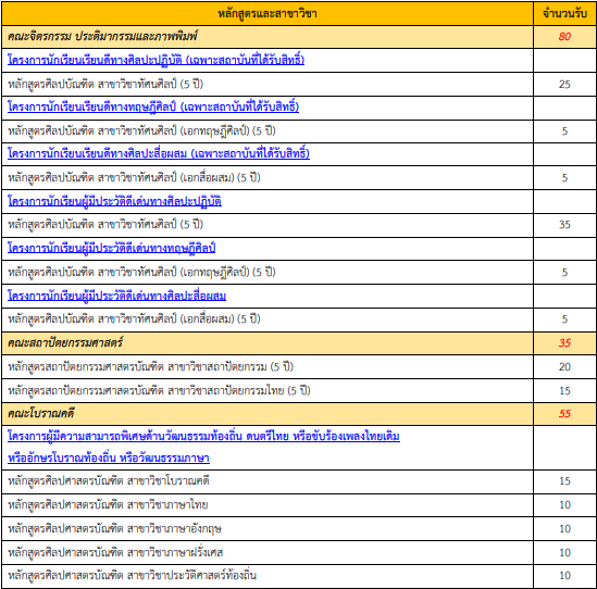 - กำหนด GPAX>3.00 ทุกโครงการ ยกเว้นโครงการผู้มีประวัติดีเด่นทางศิลปะปฏิบัติและโครงการนักเรียนผู้มีประวัตดีเด่นทางศิลปะสื่อผสม กำหนด GPAX>2.00, โครงการนักเรียนผู้มีประวัติดีเด่นทางทฤษฎีศิลป์ กำหนด GPAX>2.50