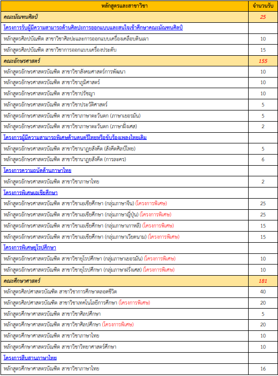 - สาขาวิชานาฏยสังคีต (การละคร), สาขาวิชาเอเชียศึกษา (โครงการพิเศษ ทุกสาขา) กำหนด GPAX>3.50