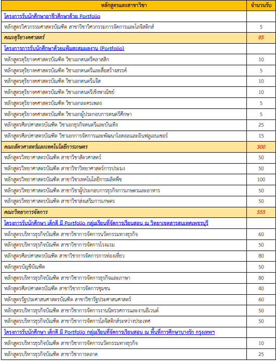 - คัดเลือกจาก Portfolio, สอบสัมภาษณ์, คะแนนสอบ TGAT/TPAT (บางสาขา)