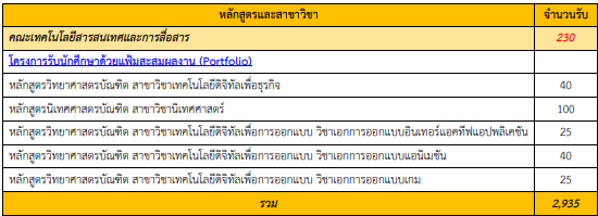 - เกณฑ์คัดเลือก ใช้ GPAX, Portfolio, TGAT, สอบสัมภาษณ์ (แต่ละสาขาใช้ไม่เหมือนกัน)