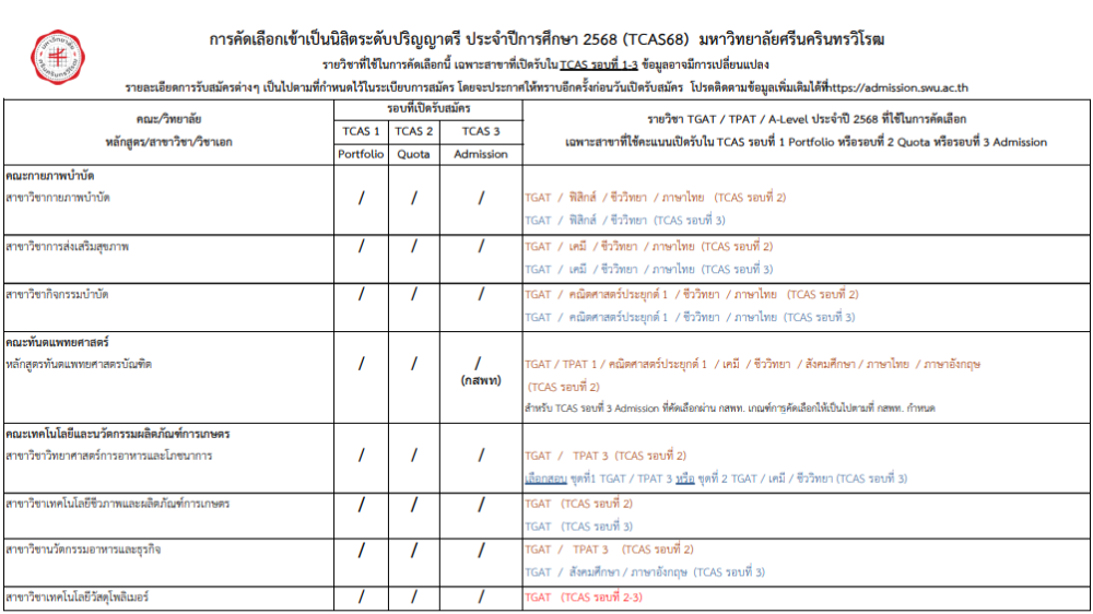 และมหาวิทยาลัยศรีนครินทรวิโรฒ ก็ได้ประกาศข้อมูลรายวิชาที่ใช้คัดเลือก พร้อมกับบอกว่าแต่ละคณะจะเปิดรับสมัครรอบไหนบ้าง ไปเช็กกันเลย