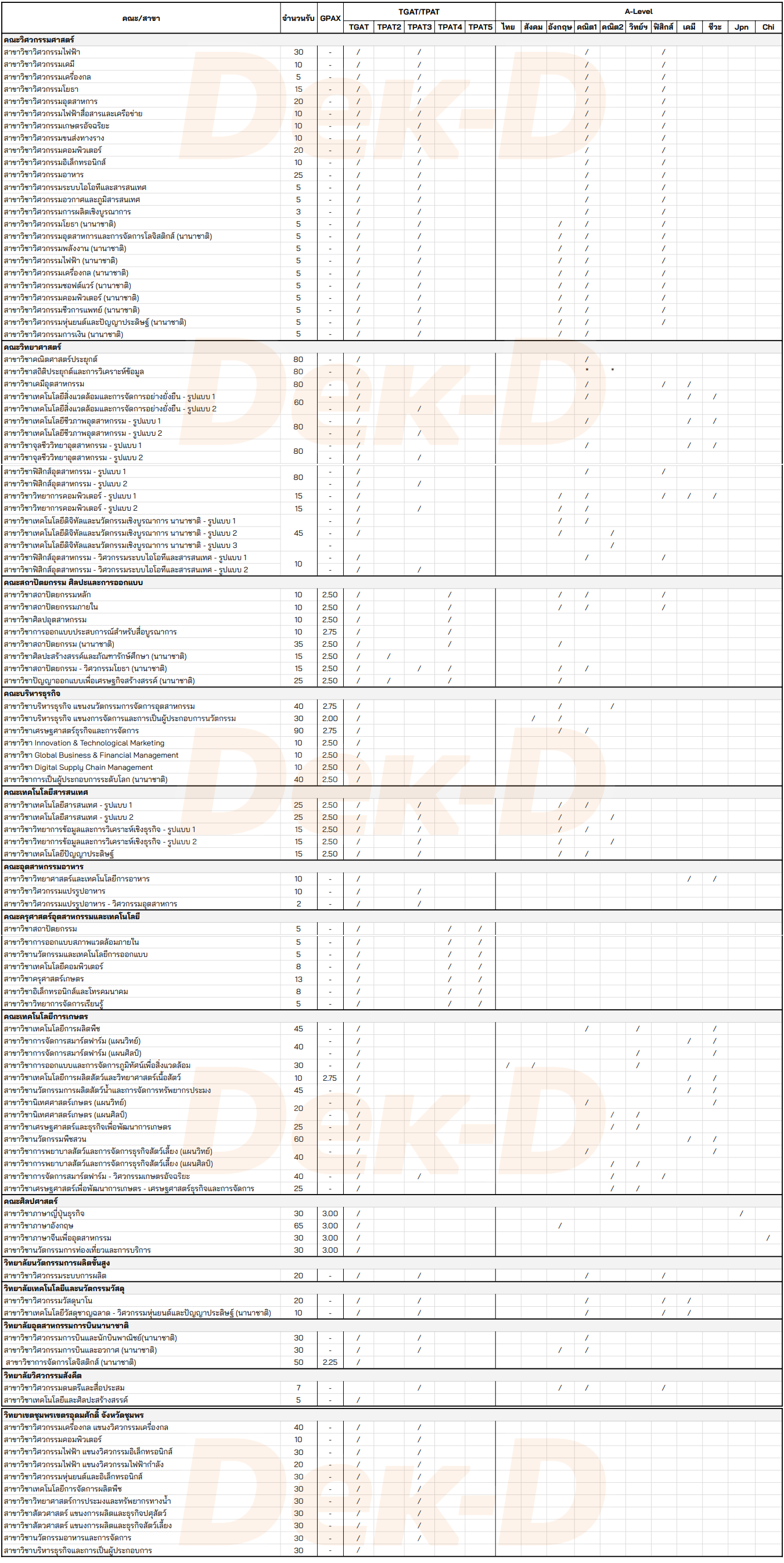- คะแนน TGAT/TPAT A-Level เท่าไหร่ก็ยื่นสมัครได้ ไม่มีกำหนดคะแนนขั้นต่ำแต่ละรายวิชา