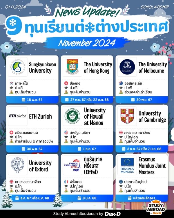 Hello Winter! เริ่มเข้าสู่ฤดูหนาวกันแล้ว~ และอีกไม่นานก็ใกล้ถึงเวลาโบกมือลาปี 2024 แต่สำหรับคนที่มีความฝันอยากเรียนต่อต่างประเทศในปีหน้า ช่วงนี้ถือเป็นโอกาสทองเลยทีเดียวค่ะ เพราะโครงการทุนทั้งจากมหาวิทยาลัยและรัฐบาลของประเทศต่างๆ เปิดรับสมัครกันรัวๆ ไม่ว่าจะเป็น เกาหลีใต้, ฮ่องกง, ออสเตรเลีย, สวิตเซอร์แลนด์, USA, UK, ฝรั่งเศส รวมไปถึงทุนอีราสมุส สำหรับเรียนต่อ ป.โท ในหลายประเทศของยุโรป // ใครอยากเป็น #ทีมต่อนอก รีบไปเช็กรายละเอียดของแต่ละโครงการกันเลยค่ะ!