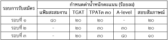 - ในวันสอบสัมภาษณ์ต้องมี TGAT รวมทุกวิชาไม่น้อยกว่าร้อยละ 20