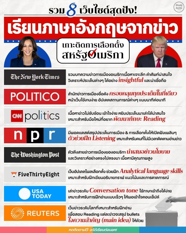 และสำหรับใครอยากติดตามข่าว US Election 2024 แบบถึงแก่น พร้อมอัปสกิลภาษาอังกฤษไปพร้อมกัน วันนี้ พี่วุฒิ และ English Issues เลยขอมาเปิดวาร์ป 8 เว็บปังๆ จากสำนักข่าวชื่อดังของอเมริกามาให้น้องๆ ได้ติดตามกันครับ
