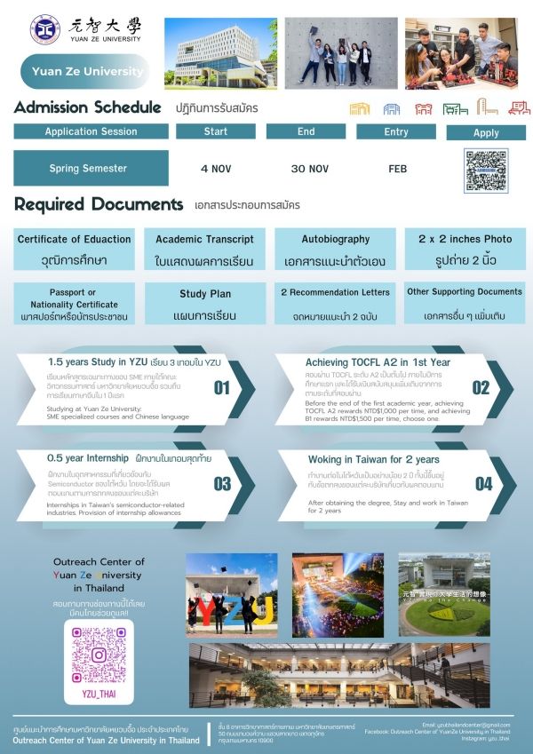 - ส่งเอกสารสมัครออนไลน์ที่ https://yzu-apply.yzu.edu.tw/ (ไม่มีค่าสมัคร)