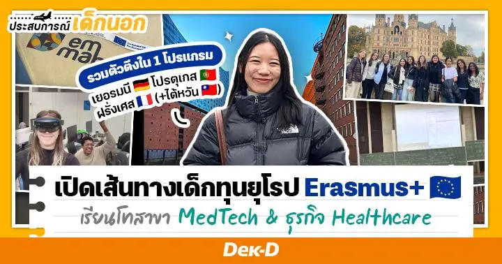 และวันนี้เราจะพาไปรู้จัก "พี่มิ้นท์-ภัครมัย คูหาชัยสกุล" เด็กทุน ERASMUS+ คนไทยคนแรกของโปรแกรม ป.โท Euro-Asian Master in Medical Technology and Healthcare Business (EMMaH) ซึ่งจะได้ไปเรียนที่เยอรมนี ฝรั่งเศส โปรตุเกส และสามารถเลือกไปฝึกงาน + ทำธีสิสที่มหาวิทยาลัยที่โดดเด่นด้านการแพทย์ของไต้หวันได้เช่นกัน