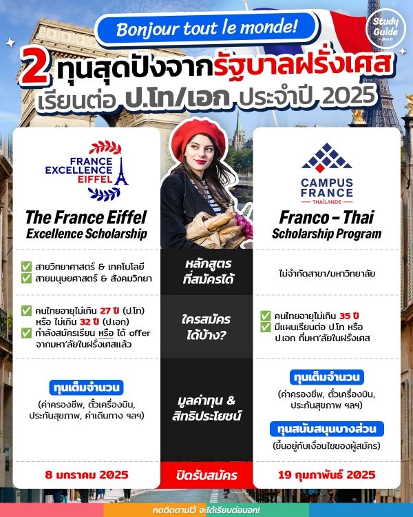 Bonjour! ช่วงนี้ถือเป็นโอกาสทองของคนที่อยากเป็น #ทีมฝรั่งเศส ก็ว่าได้ เพราะเข้าสู่ช่วงรับสมัครของ 2 โครงการทุนสุดปังจากรัฐบาลฝรั่งเศสอย่าง “Eiffel Scholarship” และ “Franco-Thai Scholarship” สำหรับเรียนต่อปริญญาโท หรือ ปริญญาเอก ในปี 2025